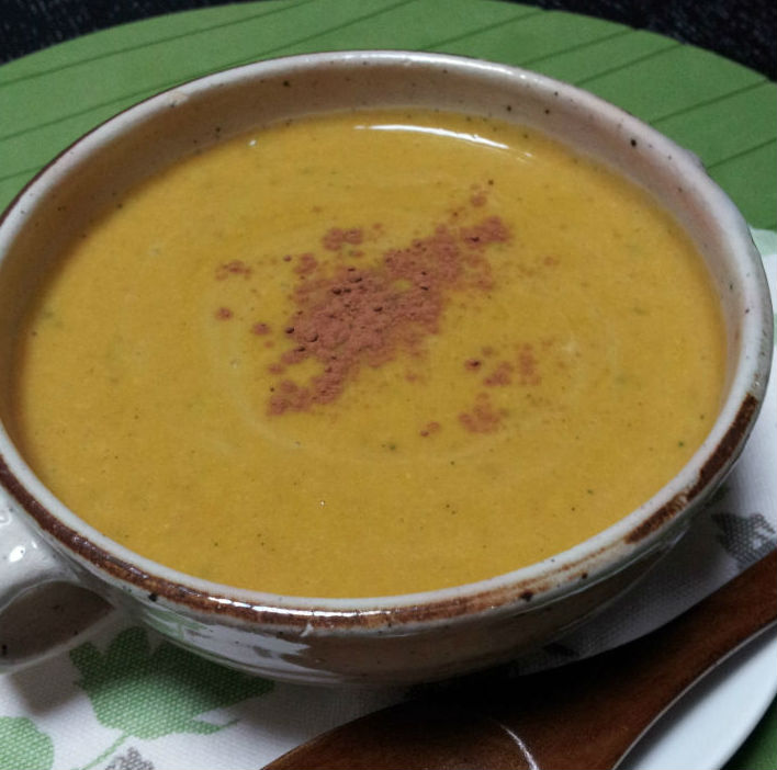 - 2に豆乳を加えて、ミキサーで撹拌しもう一度火にかけて、塩で味を調える。この時スープの濃度は豆乳でお好みに調整する。さらっとしたほうがお好みなら塩で味を調える。仕上げにシナモンをふる。