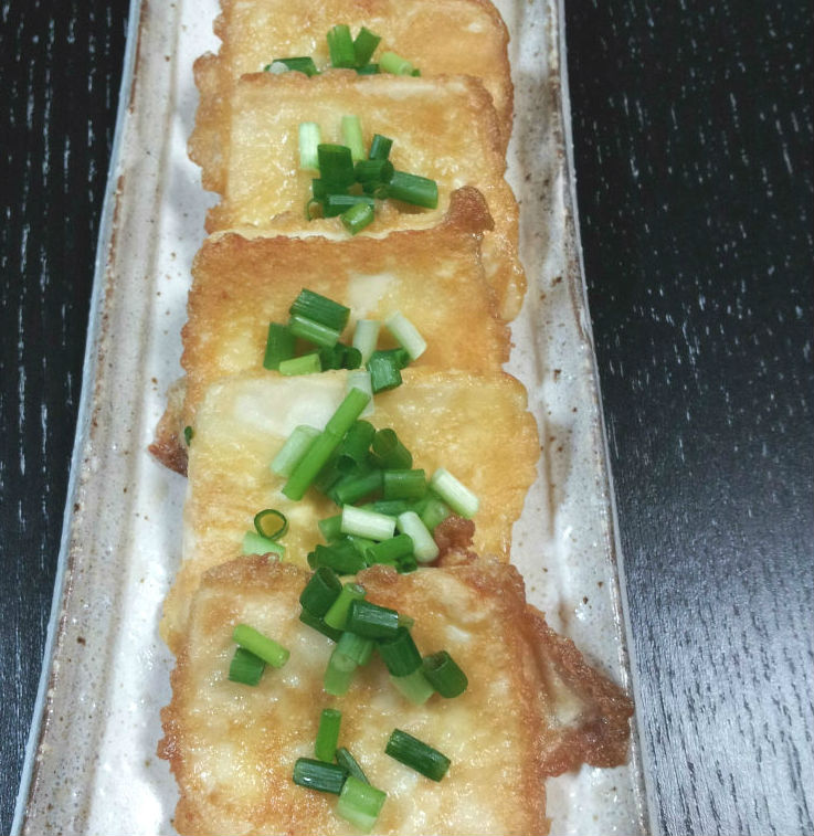 - 1に小麦粉、卵の順につけ、ごま油で両面きつね色になるまでこんがり焼く。